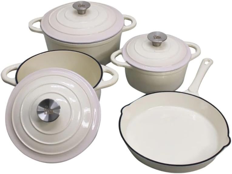 7 Piece Cast Iron Dutch Oven Cookware Pot & Stout Pan Set White