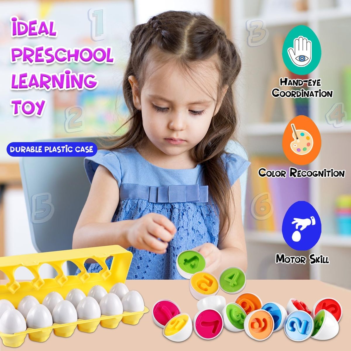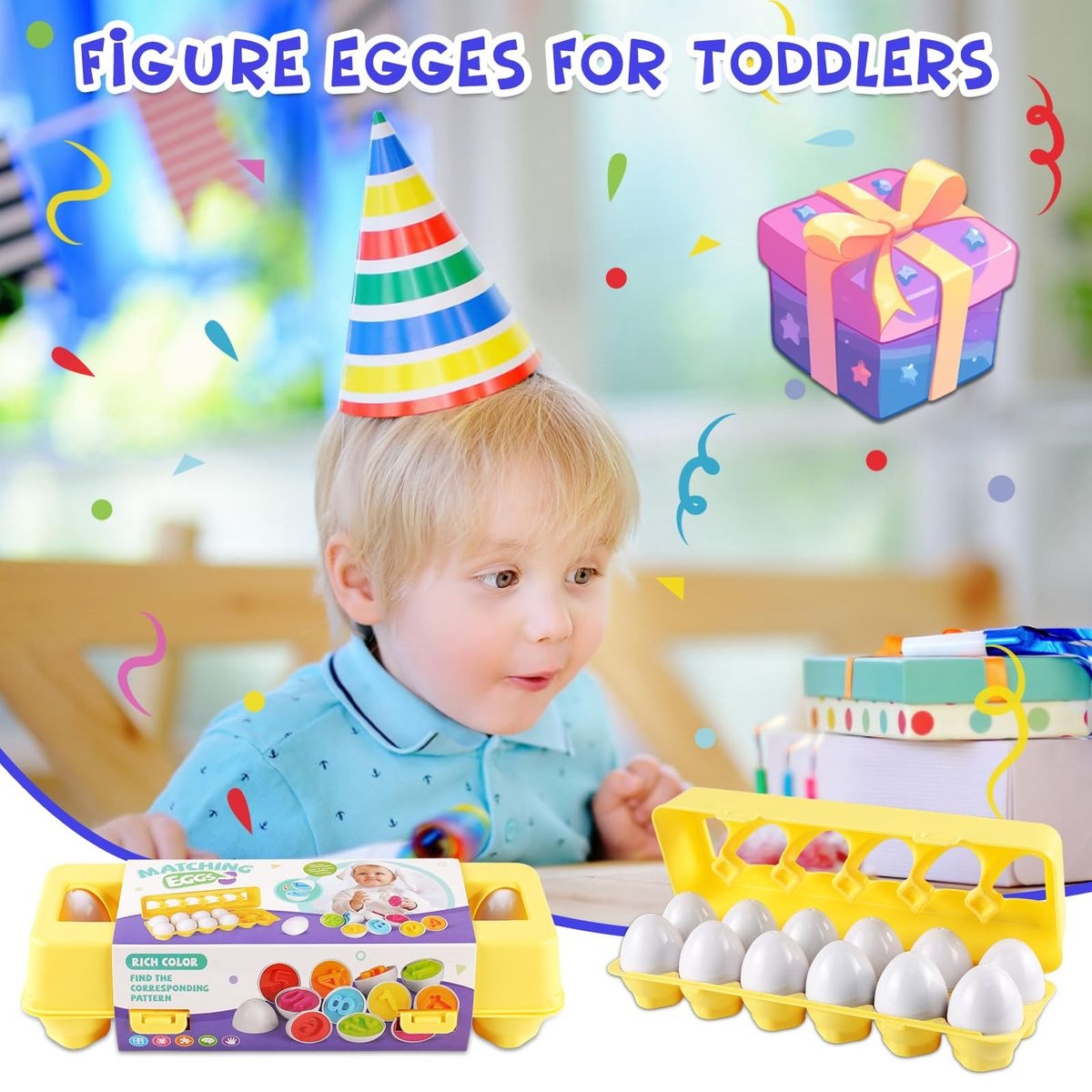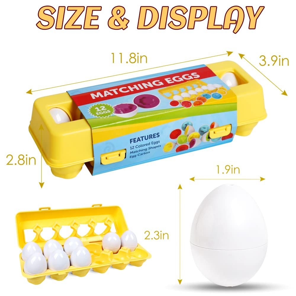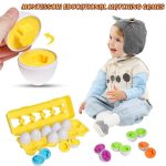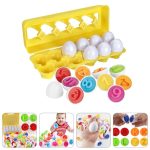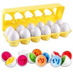 – Matching Eggs Toy: A fun realistic toy eggs for toddler sensory activities. Each package contains 12 white eggs that opened to interiors with an embossed shape and a corresponding color.