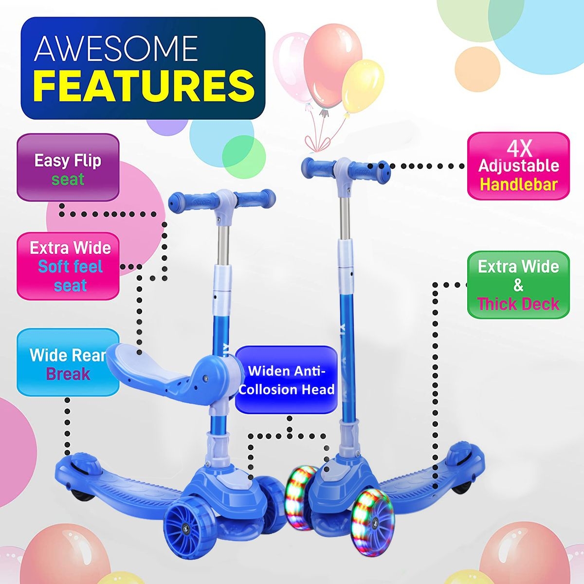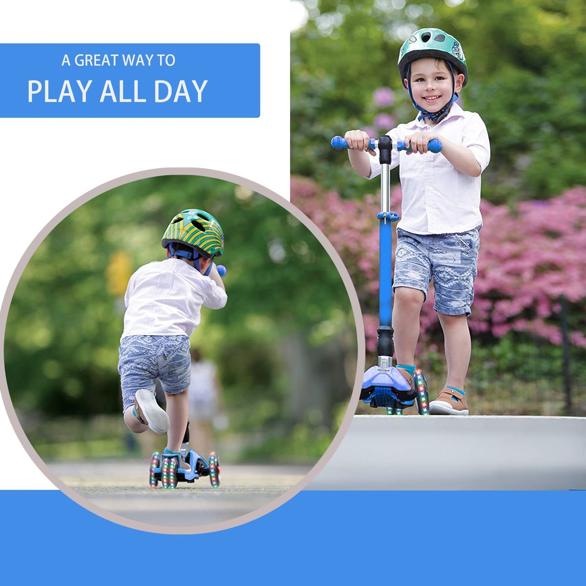 – The light-up wheels will instantly keep children interested, and they light up automatically when they’re riding the scooter, no batteries required.