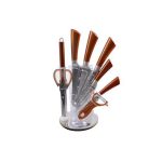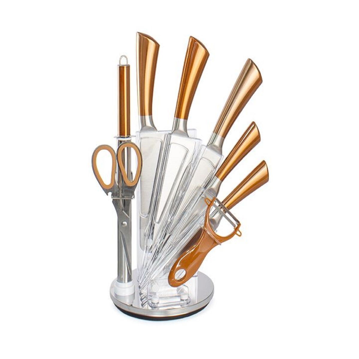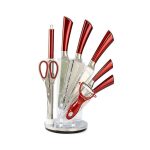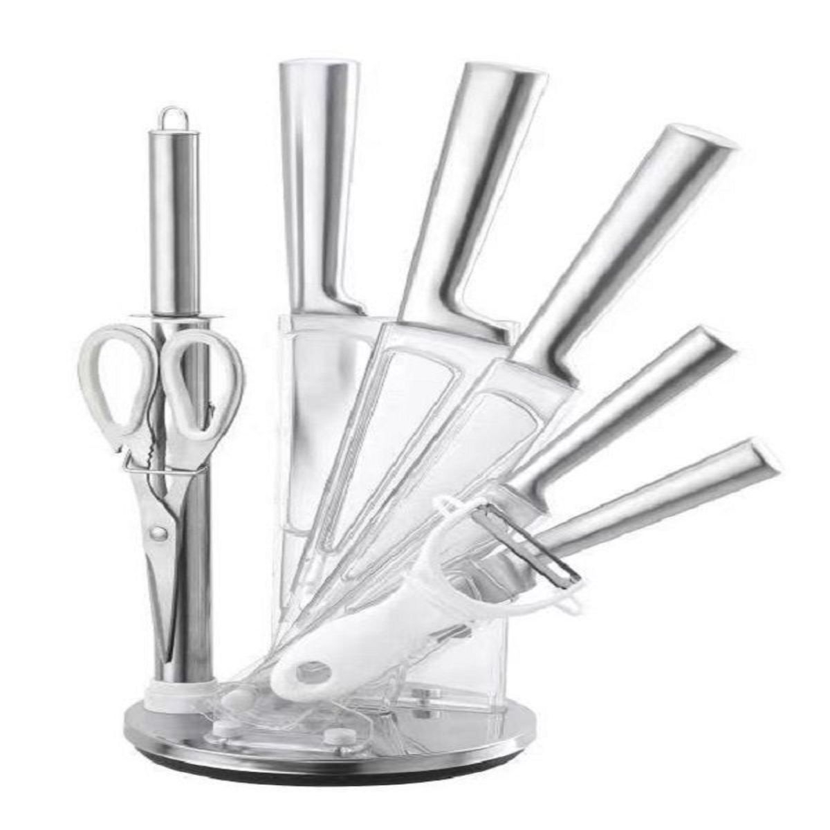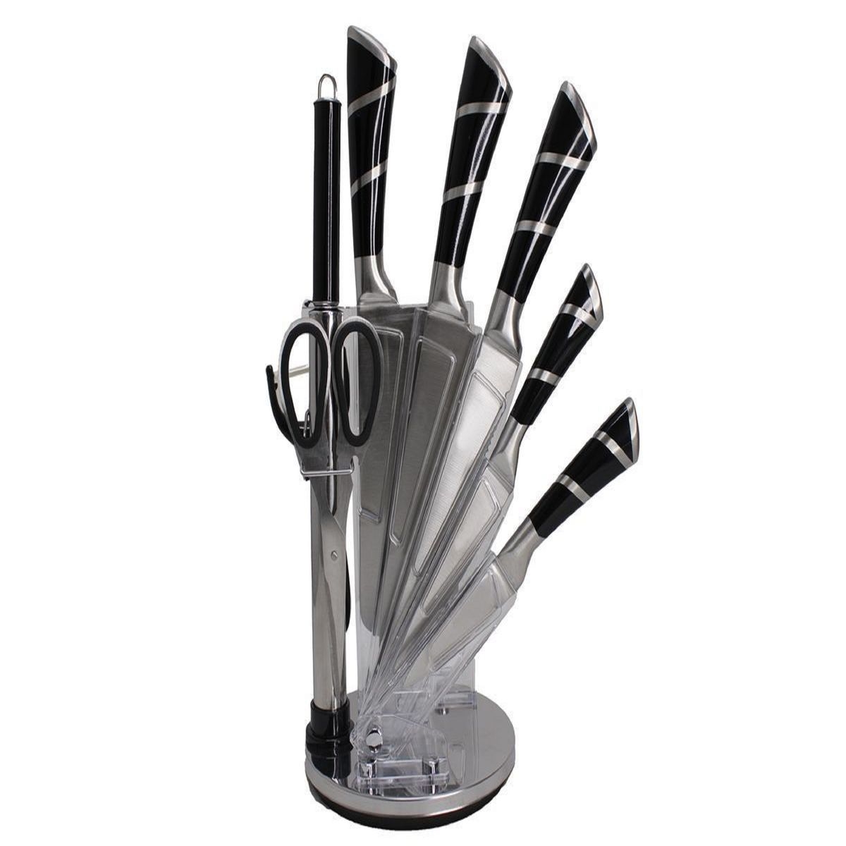 Comprehensive knife set includes all of the essential everyday kitchen knives, scissors and acrylic stand.