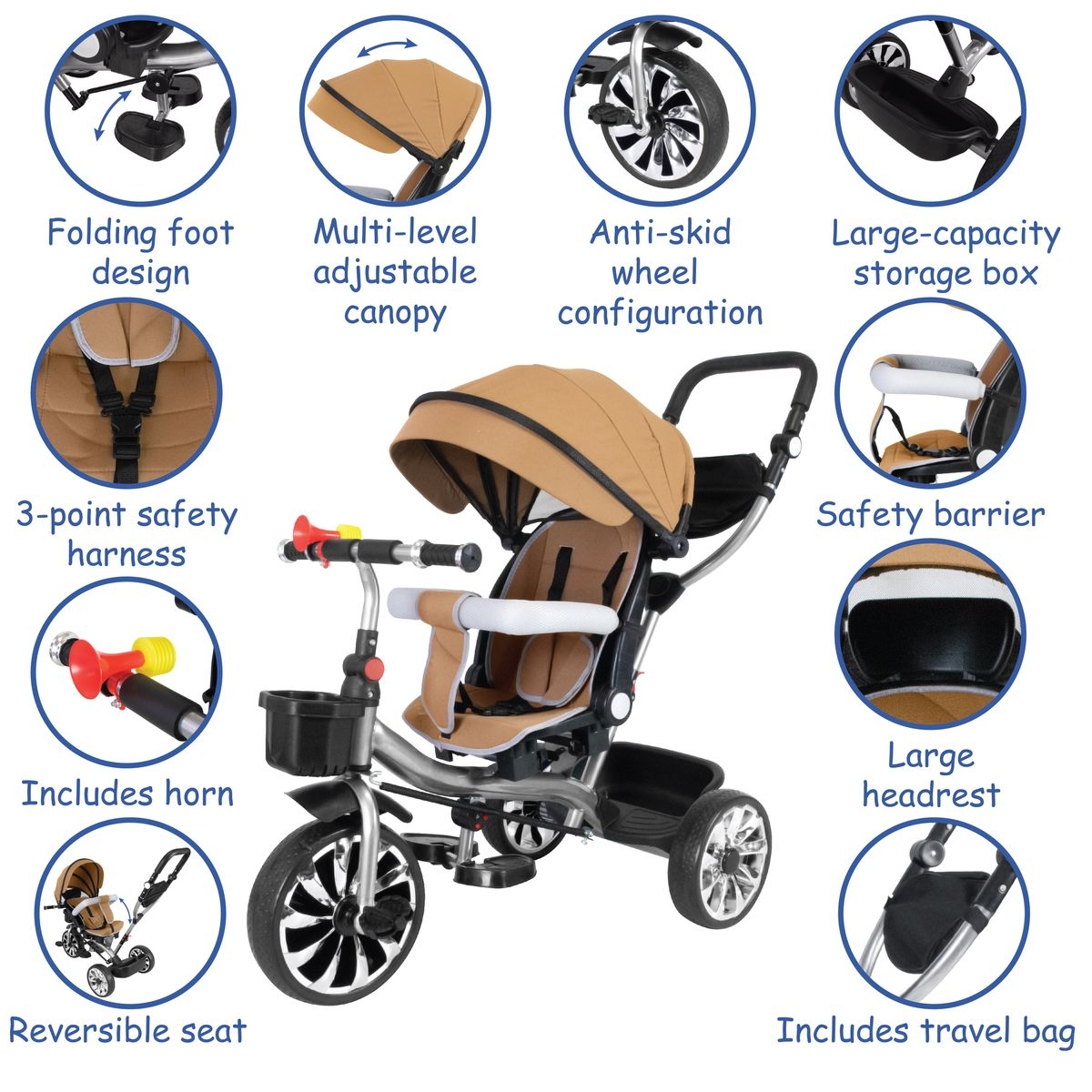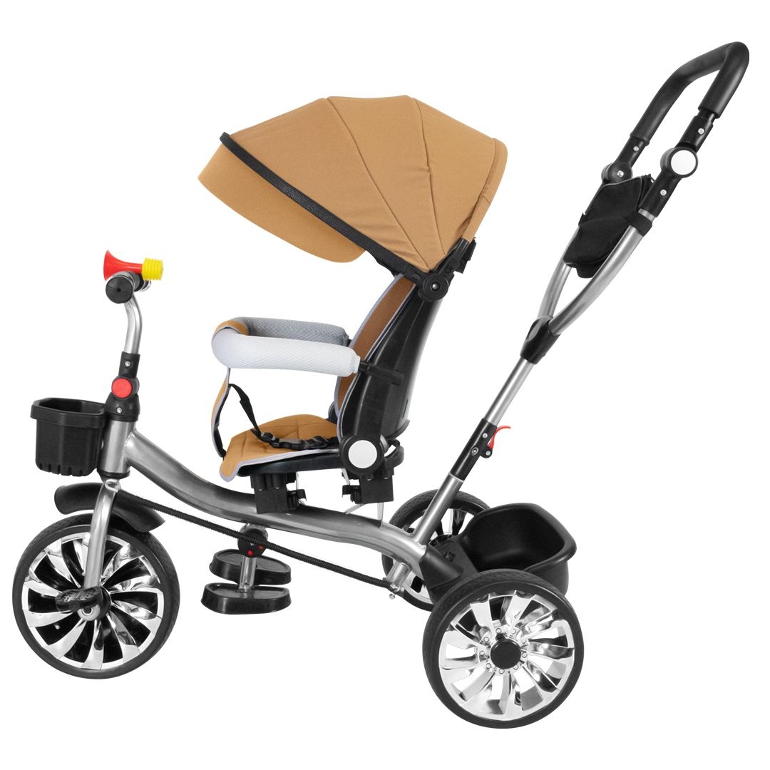 The 4-in-1 multifunctional tricycle stroller is the ultimate tricycle that helps your little one learn how to ride. This grow-with-me-tricycle offers 4 ways to ride. It easily converts from an infant trike to a steering trike, a learn-to-ride-trike, and finally a classic trike.