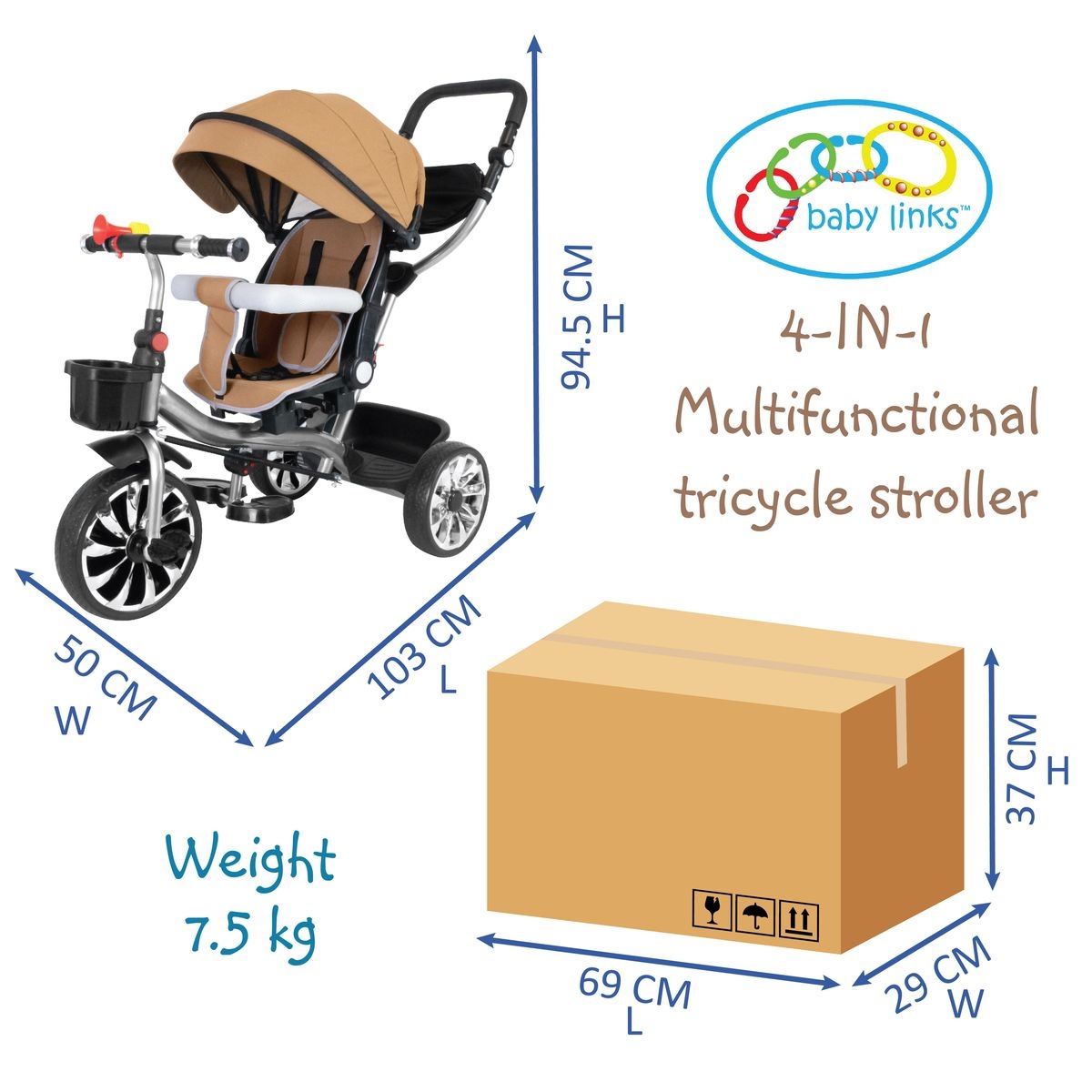 Baby Links 4-in-1 Multifunctional Tricycle Stroller with Sturdy Steel Frame