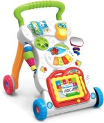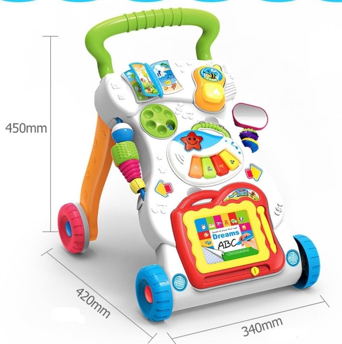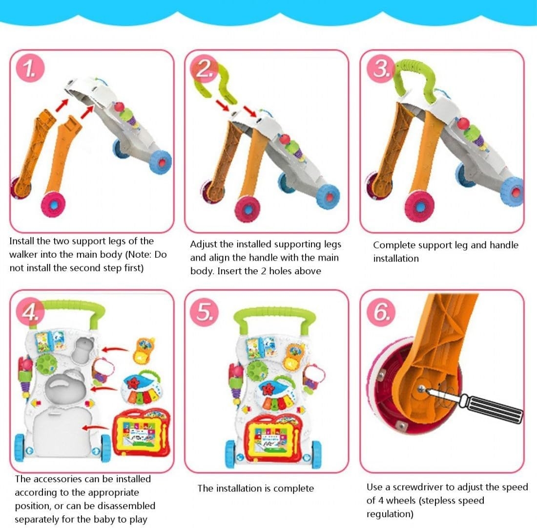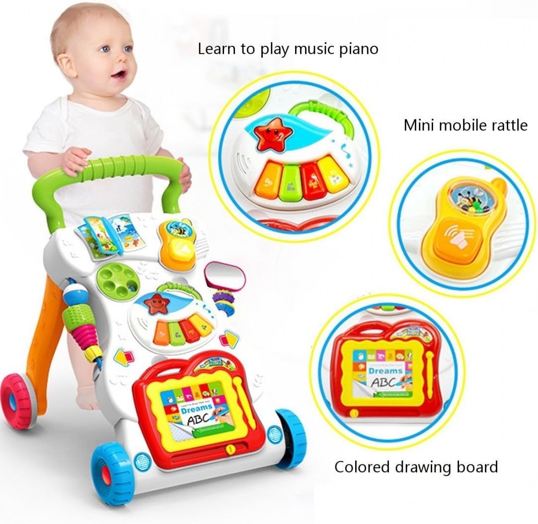 Help your baby take their first steps with confidence and joy using the Baby Music Walker! This multifunctional walker is designed to support early development and motor skills while providing endless fun. Interactive Music Panel: Equipped with a detachable activity panel featuring engaging lights, melodies, and sound effects to stimulate sensory development and keep your baby entertained. Features: With music and lights to cheer them on, your little one will have endless fun as they learn to walk.Start out with the easy-to-remove activity panel for floor play or on-the-run fun, then step it up with the fun-to-maneuver walker. A drawing board, an electronic organ, a small book, a telephone handset offers endless fun that will stimulate your baby’s learning and develop their motor skills. This walker is able to exercise your baby’s hearing, sense of touch, child’s cognition of different shapes, and learn to walk scientifically. Adjustable screw enables you to adjust its speed in accordance with the pace of the baby learning to walk, so the baby can learn to walk in a more safe and scientific way. Triangle solid structure, the walker can assist the baby to maintain the balance of the body so as to form the correct walking posture. Special made rubber rear-wheel, the friction is greatly increased, non slip. There are non slip textures on the arm, your baby won’t fall down when grasping it. Specifications: Material: ABS Age: 9 month Foldable :Yes Pattern Type :Character Numbers of Wheels : Four Wheels Item Size: 32 * 42 * 45 cm