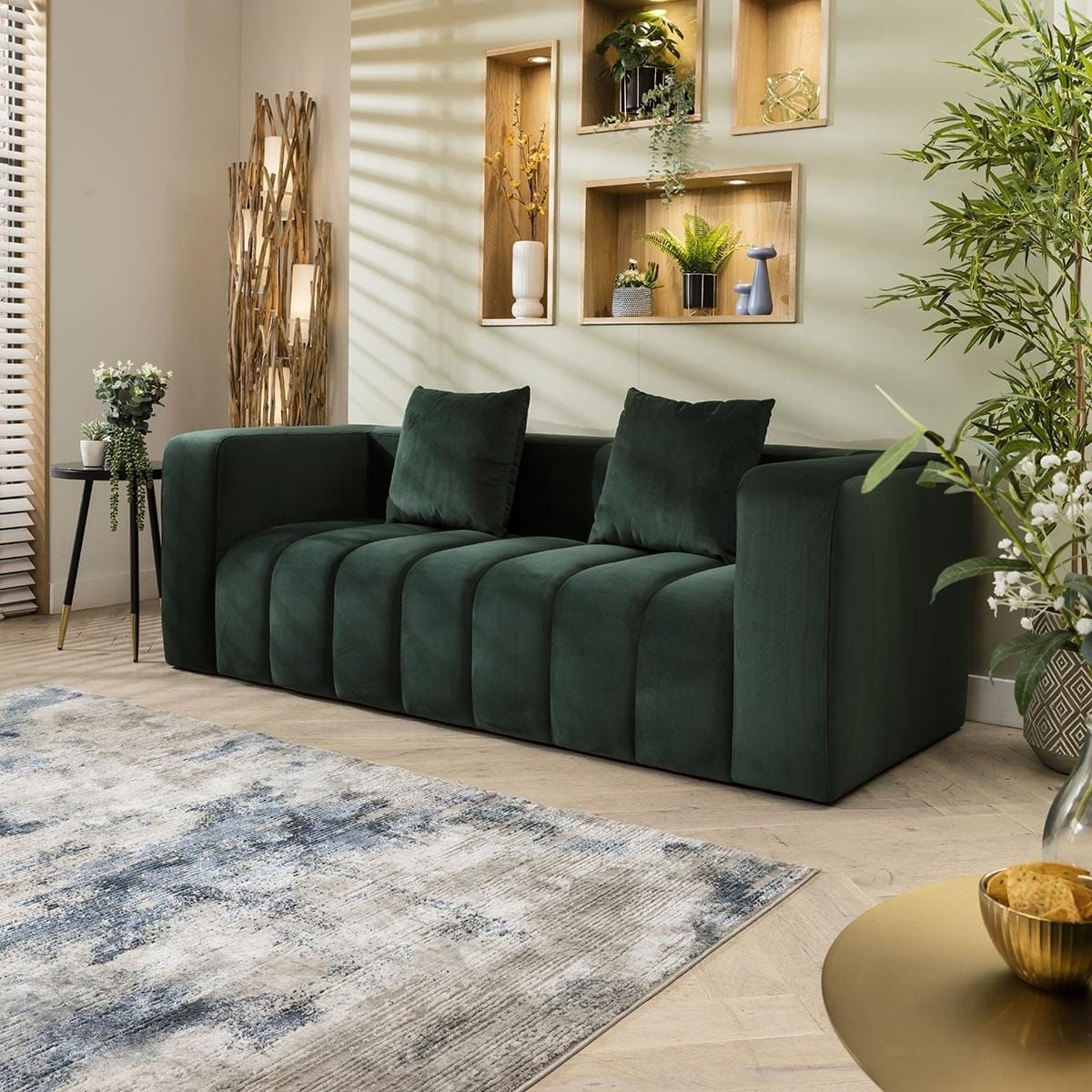 1 x Bailey Green Velvet 3 Seater Panel Sofa