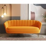 It’s made with a solid wood frame and sits on splayed, metal legs with a gold finish. This couch is wrapped in velvet upholstery in a solid color and features a round, Arc back Channel-tufting that adds a tailored touch, tying together to the glam aesthetic.