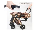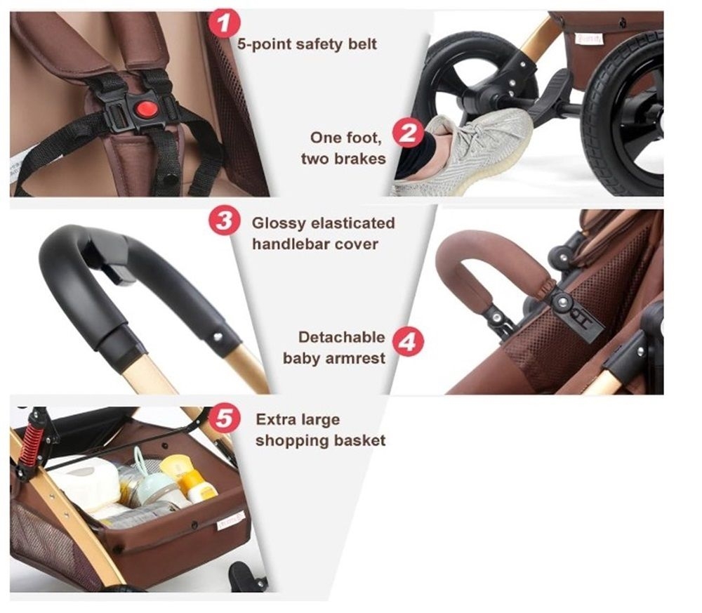 Super natural rubber explosion-proof wheels with foot pedal brake and a spring shock absorber which will keep your loved ones rest or exist conveniently. Both seats are designed with 5-point safety belts.