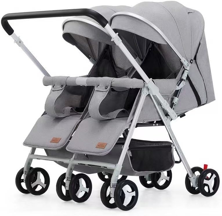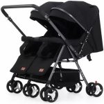 - Sturdy and lightweight double stroller for twins or siblings; Adjustable canopies provide shade and protection; Safety ensured with a 5-point harness system; Spacious under-seat storage for baby essentials; Easy to fold for travel and storage convenience; Available in elegant Black and Grey colours.