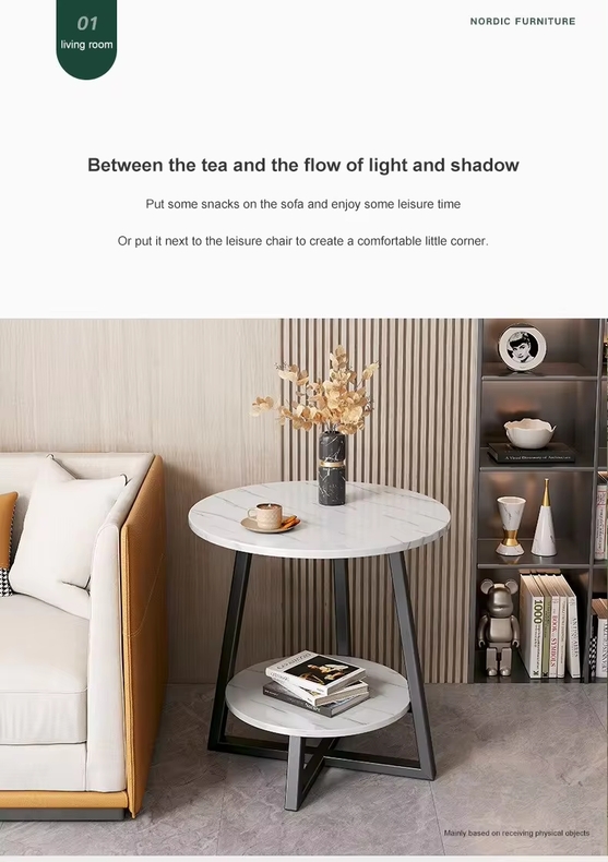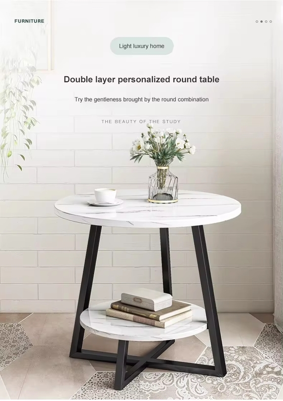 New round two-story small coffee table, small round tables in the living room and bedroom. There are two colors, black and white, and a double layered personalized round table. It can be a small coffee table next to the sofa for reading and drinking tea, relaxing and relaxing. It can also be a small decoration in a corner of the space, placed in any position to liven up the furniture atmosphere, set up snacks, semi recline on the sofa to enjoy leisurely time, or placed next to a leisure chair, creating a comfortable small corner. The spacious countertop allows for easy storage of small items such as books and potted plants, without any sense of crowding. The design of the upper and lower layers improves utilization, making it convenient and practical. The entire edge of the table is round, which makes it less likely to be bumped or injured when walking. The round table has thicker panels, solid materials, and a longer service life. The cross steel frame structure is scientifically stressed, with four legs providing double stability and not easy to shake. The wooden structure is excellent and has a tight texture, making it suitable for making indoor furniture. Tea table size: 50cm x 50cm x 55cm