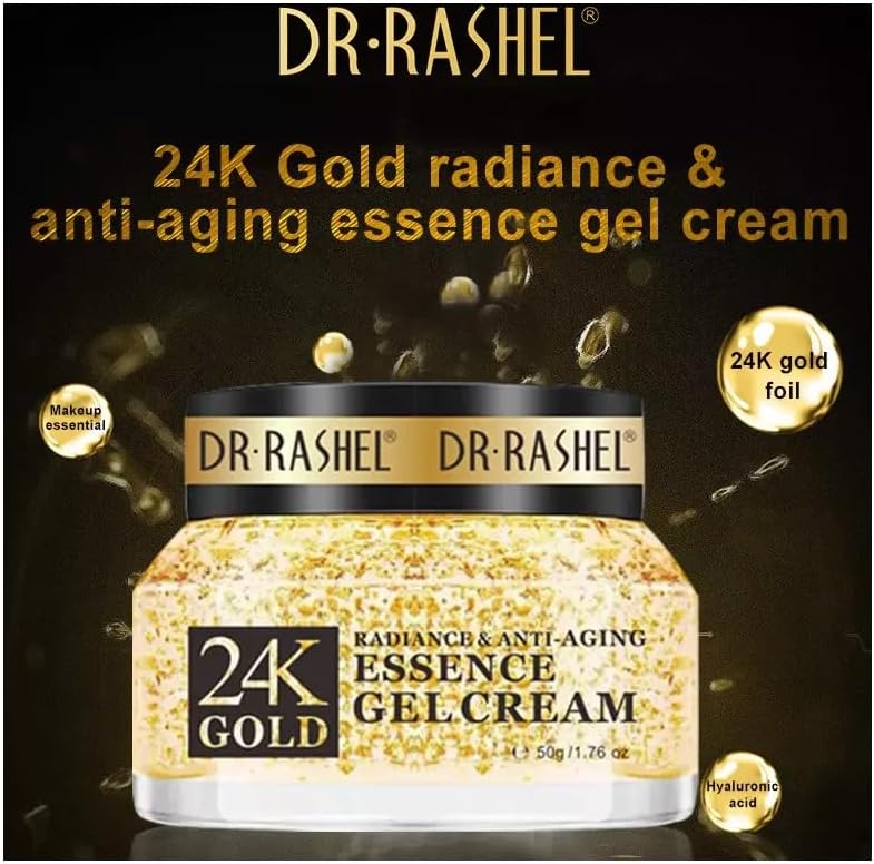 50g Benefits : 24K gold essence gel cream illuminates and brightens skin immediately while reducing age spots. Nourishes the area of the face that shows aging signs while reducing visible lines and wrinkles. Pure gold rapidly plumps lines and wrinkles to give your skin a satiny smoothness, boosts texture and rejuvenates skin’s appearance. Truly the gold standard of de aging, this newly enhanced skin-enriching super serum, with a fresh new scent, gives your face a 24-karat glow. Increases firmness and elasticity improves your skin’s vitality Use For : Face, Neck Gel Cream Feature : Moisturizer – Anti-Wrinkle – Anti-Aging – Moisten and Soften Skin – Firmness Skin Type : Suitable for all skin types Ingredients : Aqua, glycerin, propylene glycol, corn gluten amino acids, glyceryl polymethacrylate, propylene glycol, glyceryl acrylate/acrylic acid copolymer, pvm/ma copolymer, carbomer, triethanolamine, phenoxyethanol, ethylhexylglycerin, hydroxyethylcellulose, chlorphenesin, peg-40 hydrogenated castor oil, sodium hyaluronate, niacinamide, tremella fuciformis polysaccharide, sodium benzoate, euglena gracillis polysaccharide, hydrolyzed collagen, fragrance, gold, ci 19140, ci 16255 How To Use : Apply a small amount to a thoroughly cleansed face and neck. Massage into skin using fingertips. Use in the morning as a moisturizer makeup base and at night as a nourishing night cream.