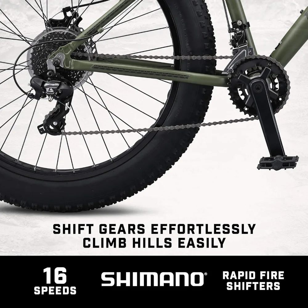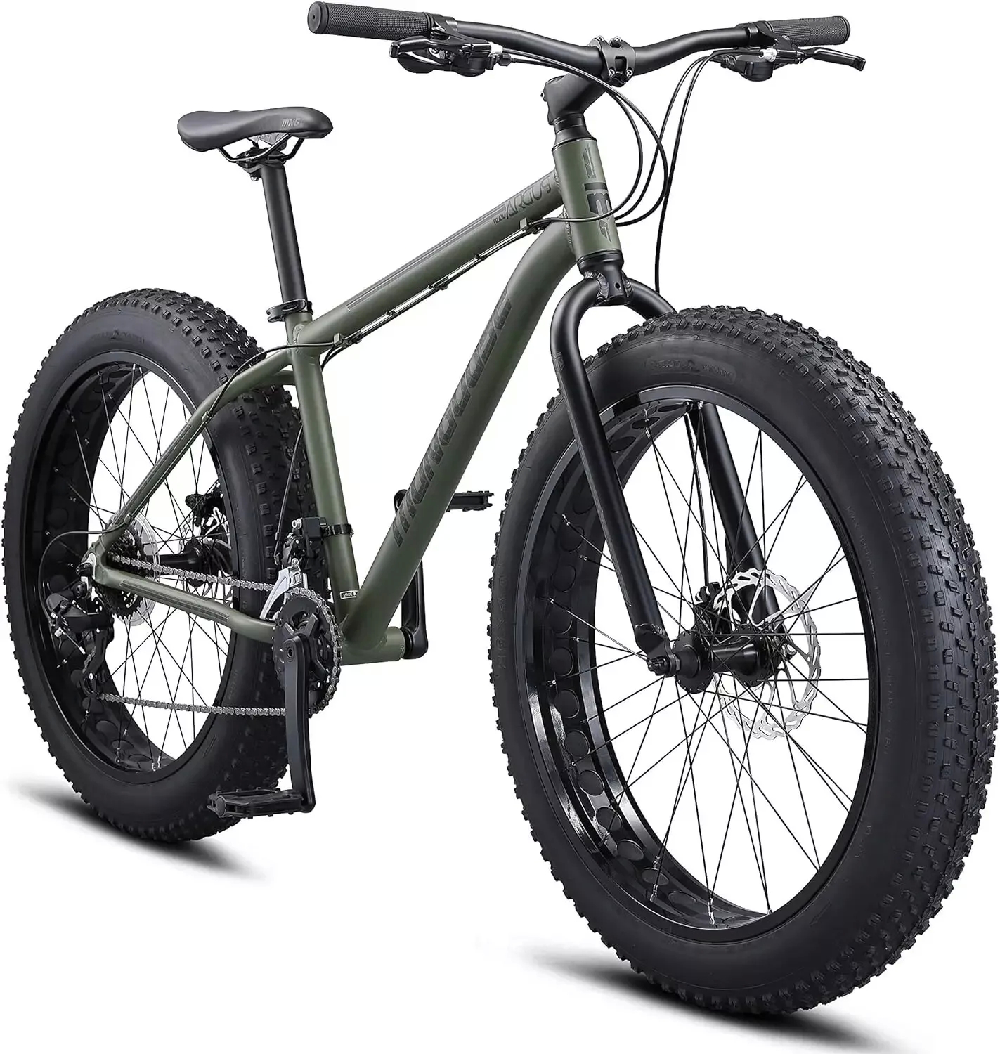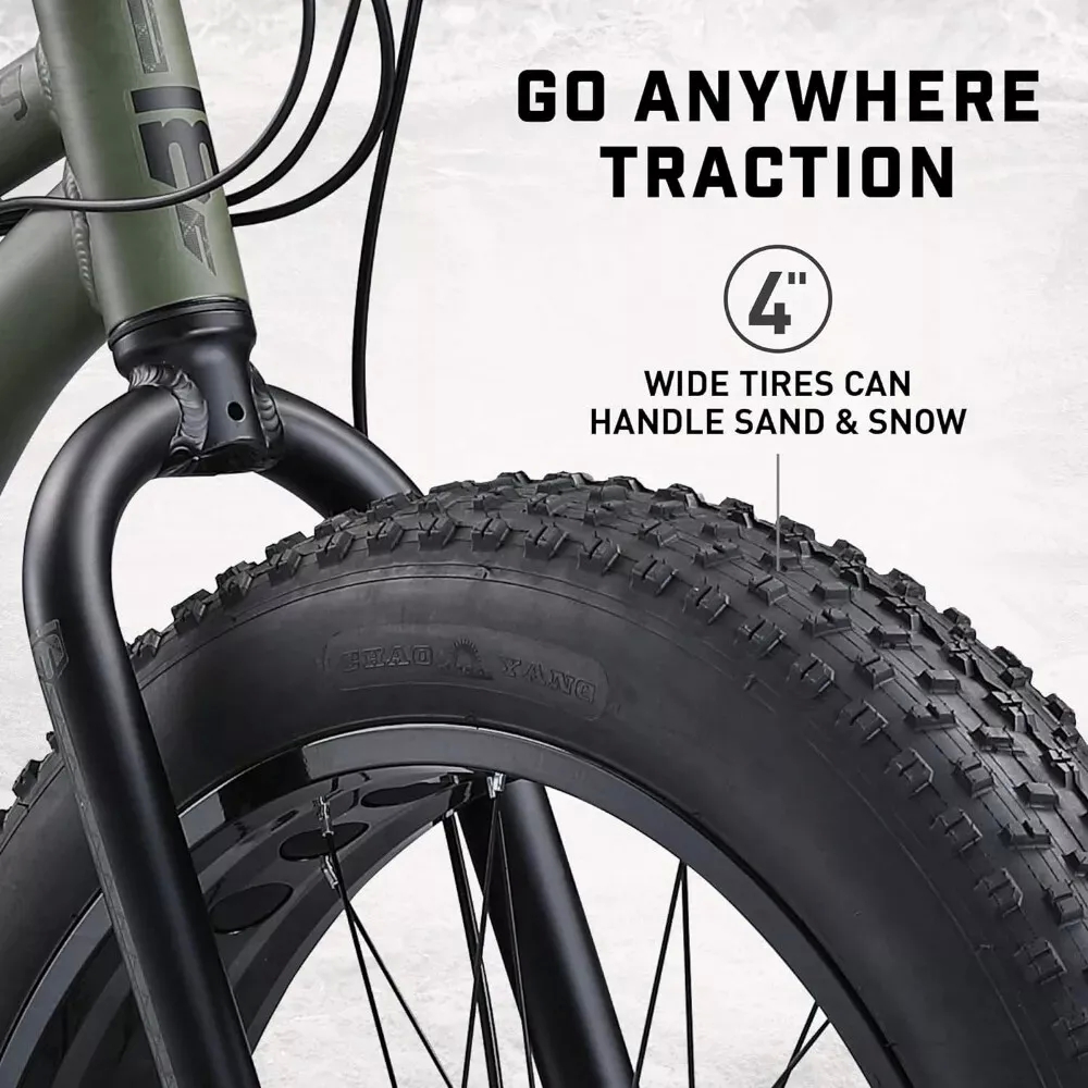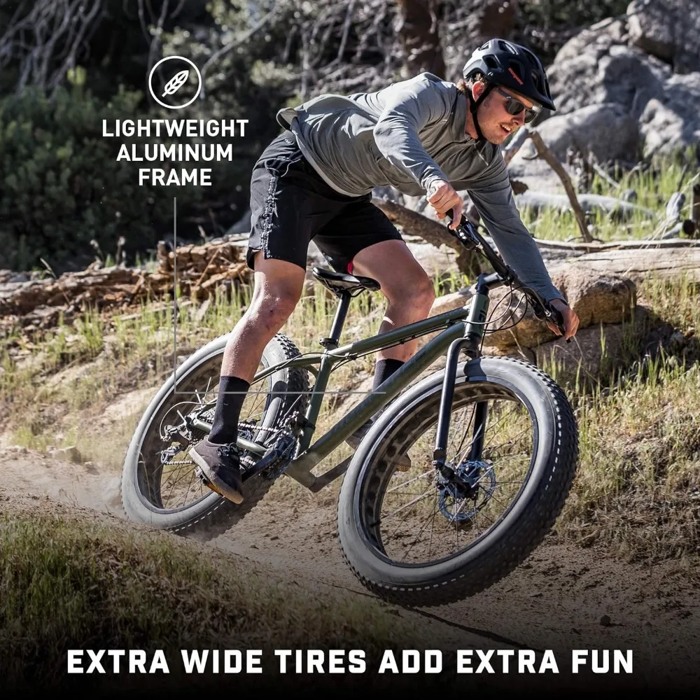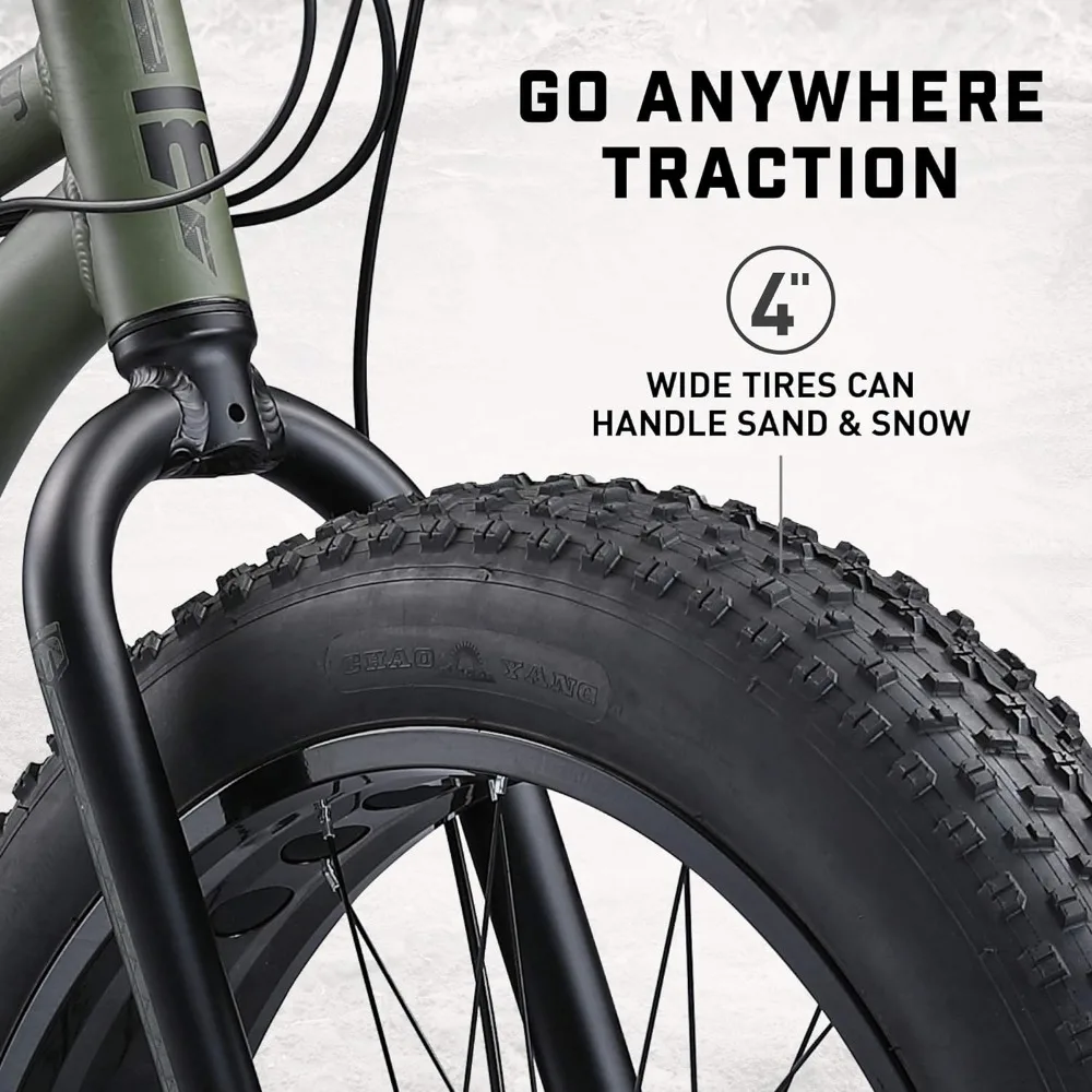 - Fat tire mountain bicycle perfect for all-terrain adventures, 26-inch wheels, and large frame to fit riders 5’10” to 6’1″ tall