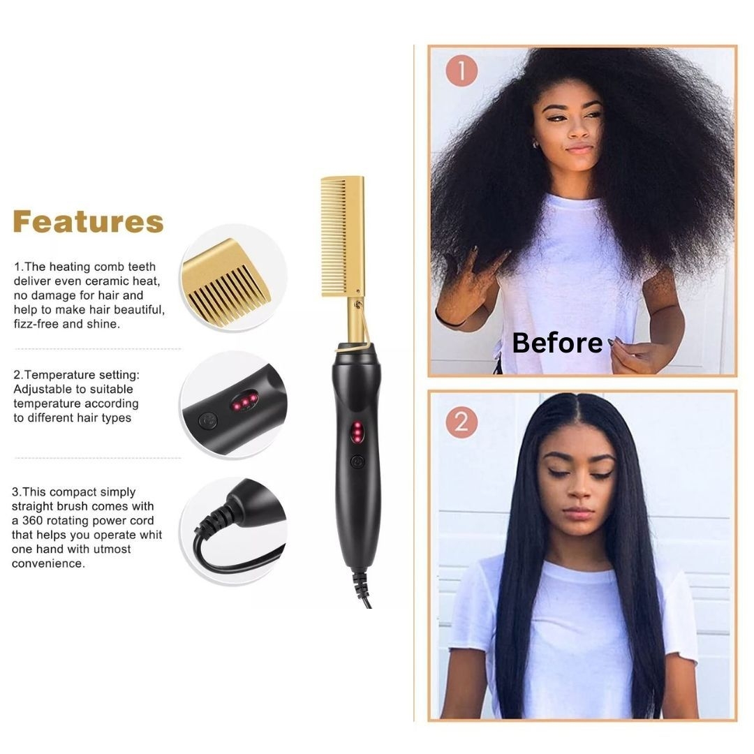 Lightweight gold ceramic press comb. Great for hair straightening extensions, curly hair, silky hair, and 4c hair. Get wet hair to dry hair in seconds. Curly to straight in minutes.