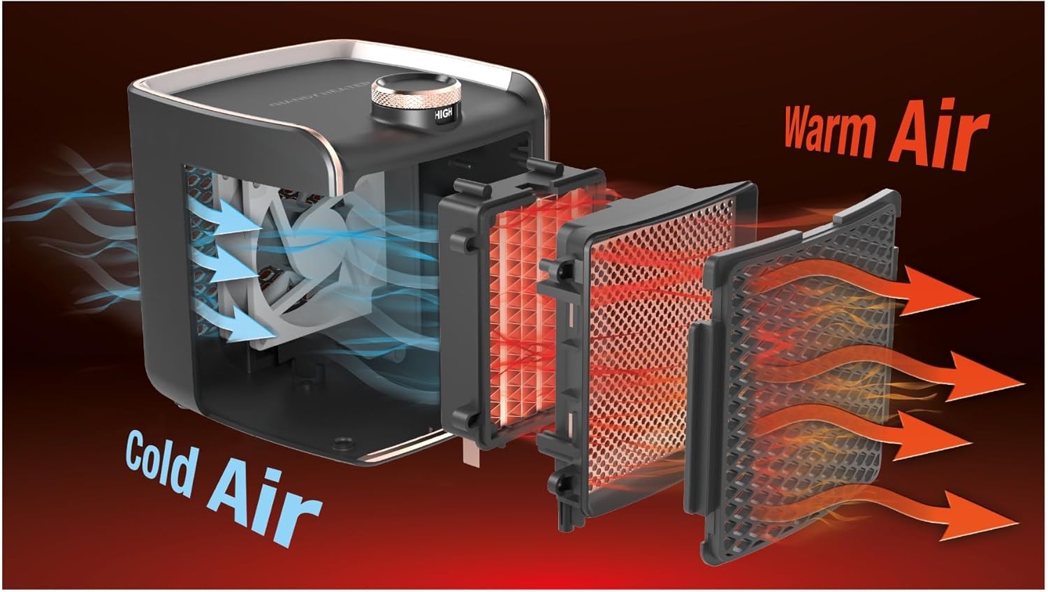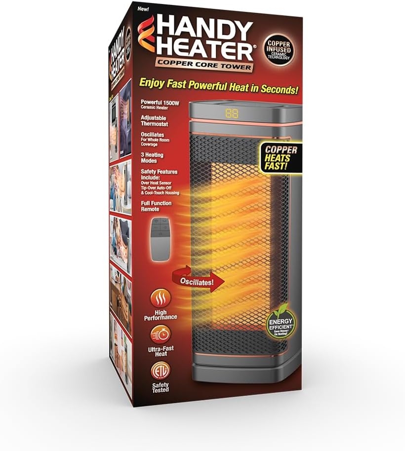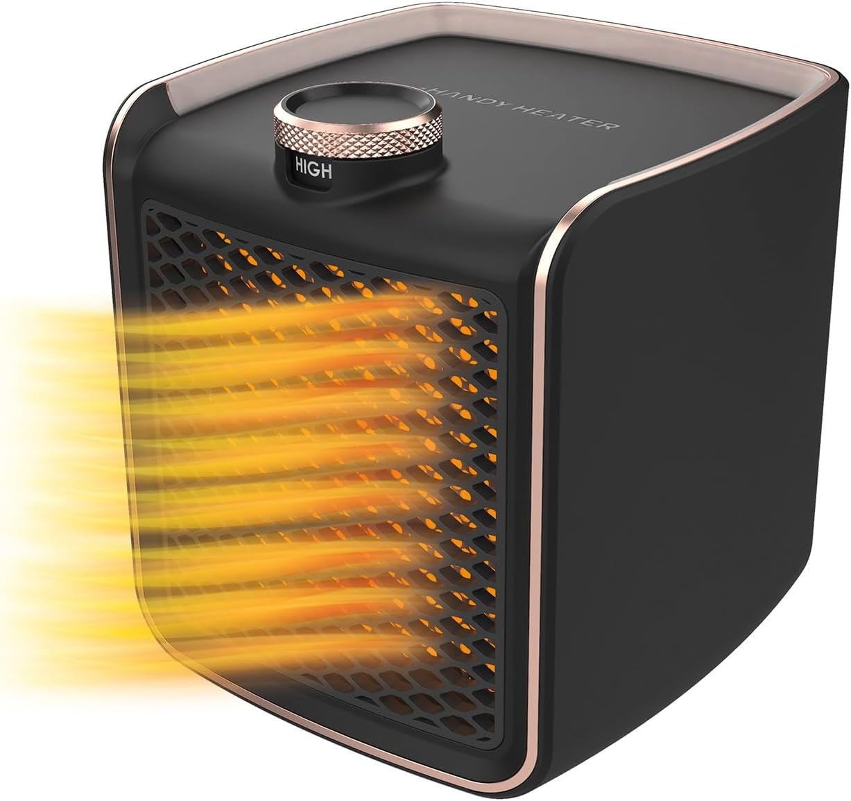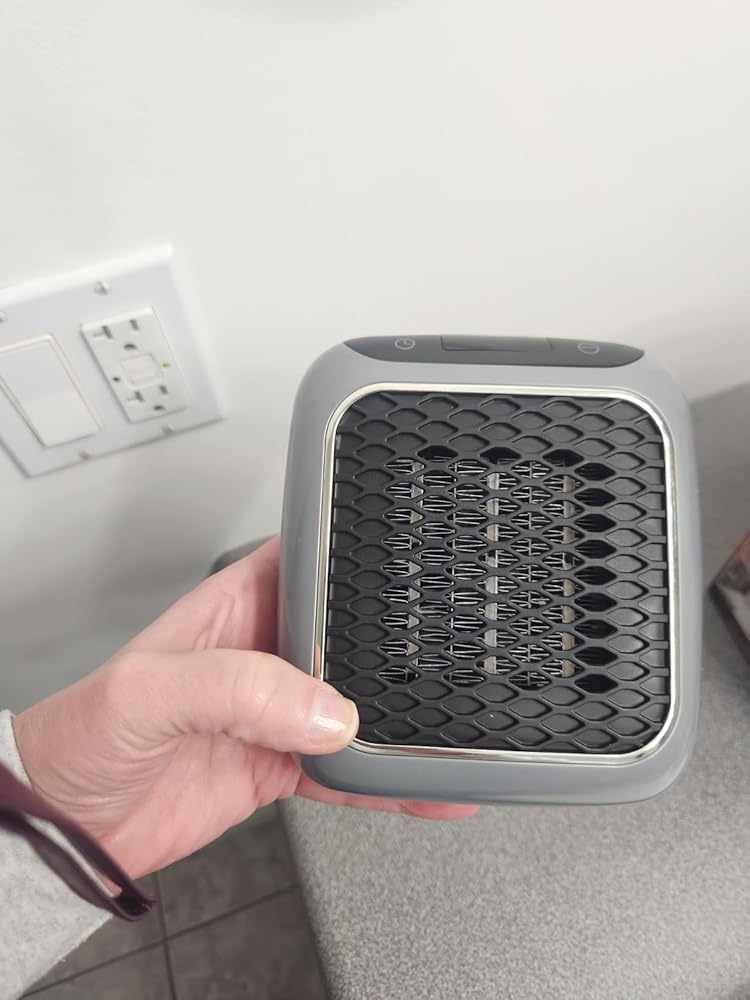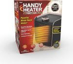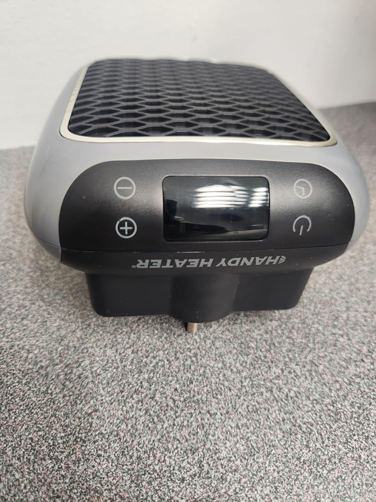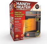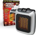 Really impressed with the compact and portable size of this Handy Heater Turbo Heat wall outlet heater! It kept my feet toasty warm under my desk. It puts out alot of heat in the front of the unit, but the housing stays cool.The front plate does get quite hot. I do not recommend that any children or pets be allowed to go near the unit while it is plugged in because of the risk of burns. Combustible items have to be 3 feet away from it so items don’t block air going in, or coming out and causing the unit to overheat and the potential risk of fire . Curtains or paper products should not be anywhere near the heater. I would not put a pet bed under the heater or next to it.I did try using the heater in a bigger room afterward, but it did not perform there as well. I feel this heater is made more for smaller rooms. It would be nice if it had a remote and also if the little rubber foot pads would stay on better. They are easy to put back in though, but just be aware in case yours come out so you dont loose them.. I do recommend this product as it did what I wanted to do.