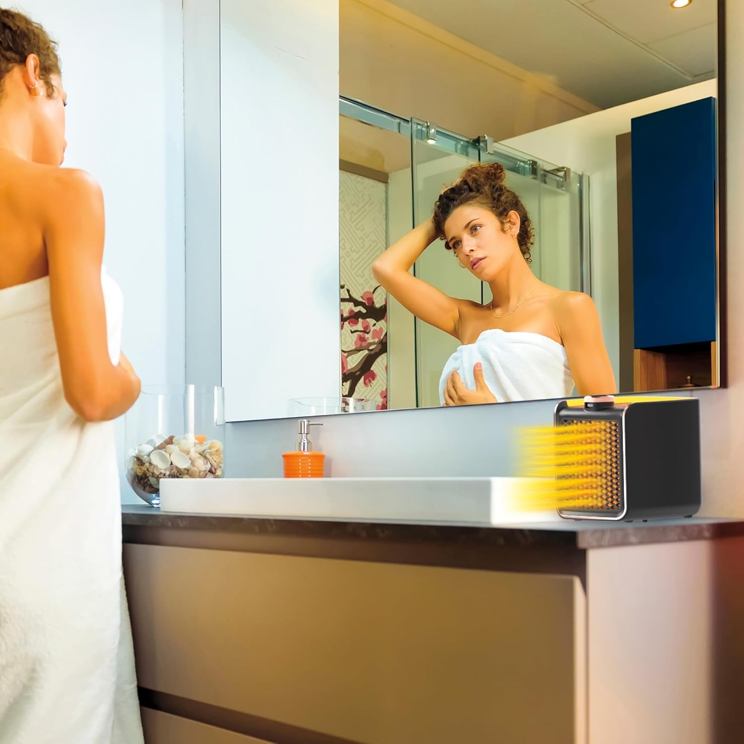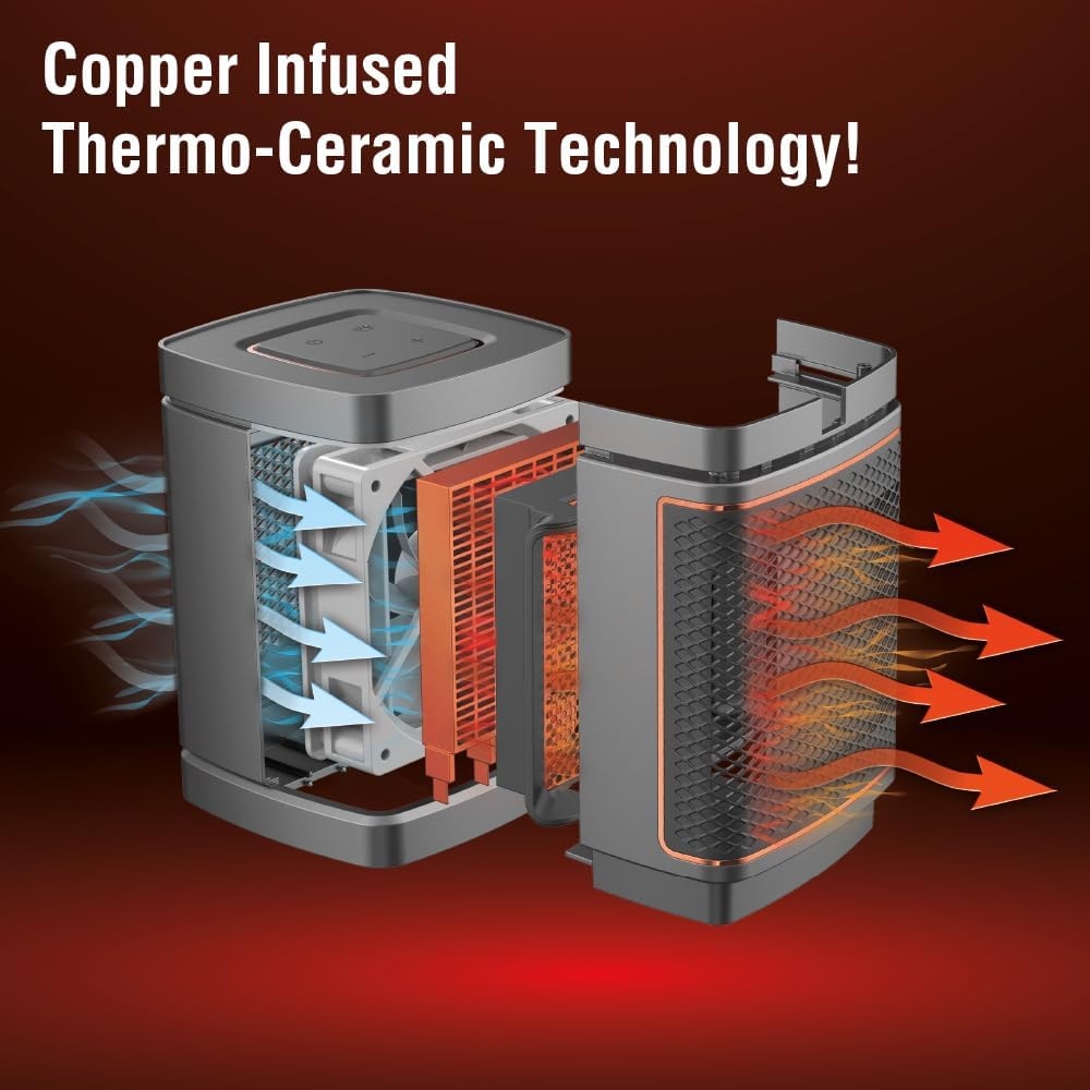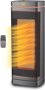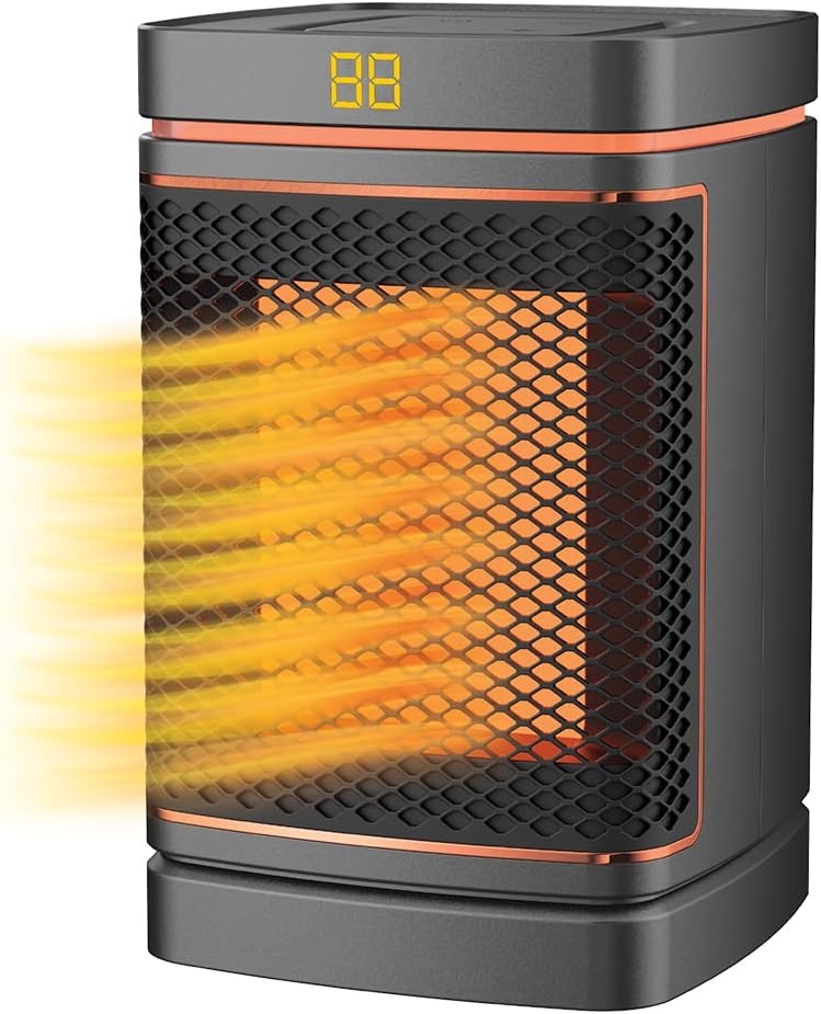 The heater is small but gets to work extremely fast. It heats a smaller area quickly and goes to 90 degrees for warmth. Its adjustable temperature allows for easy control with the timed temperature setting. I purchased it to put in my crafting area. I wouldn’t recommend it being in areas with small children or pets unless it’s in an unreachable area from them. It gets pretty warm, and they could get burned if they touch it. Otherwise, I think it’s great!