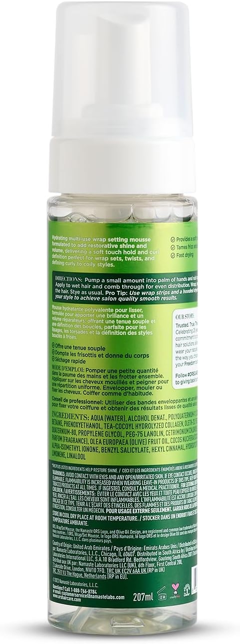 The ORS Olive Oil Wrap/Set Mousse is a lightweight mousse designed to hold, moisturize and give incredible added Shine to the hair. These ingredients help provide smoother wrapping, moulding and longer lasting roller sets.