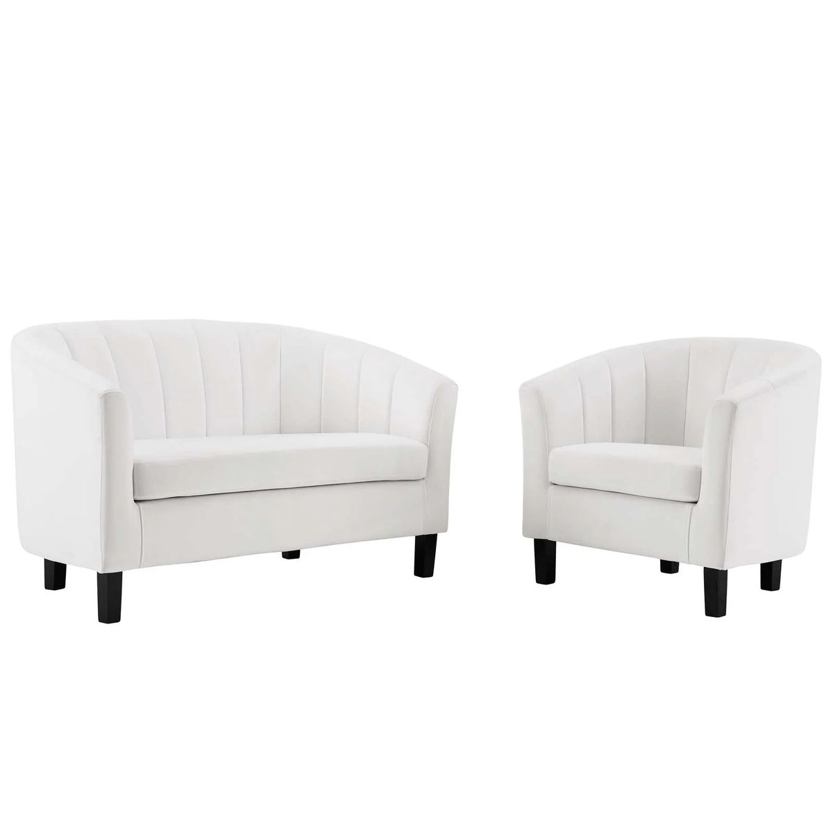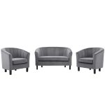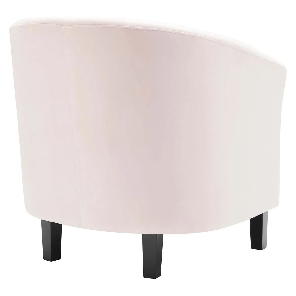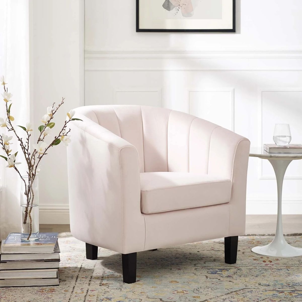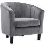 This barrel back set comes upholstered in stain-resistant performance velvet fabric, and boasts chic channel tufting, updating the Chesterfield-inspired profile with retro-modern design elements.