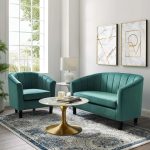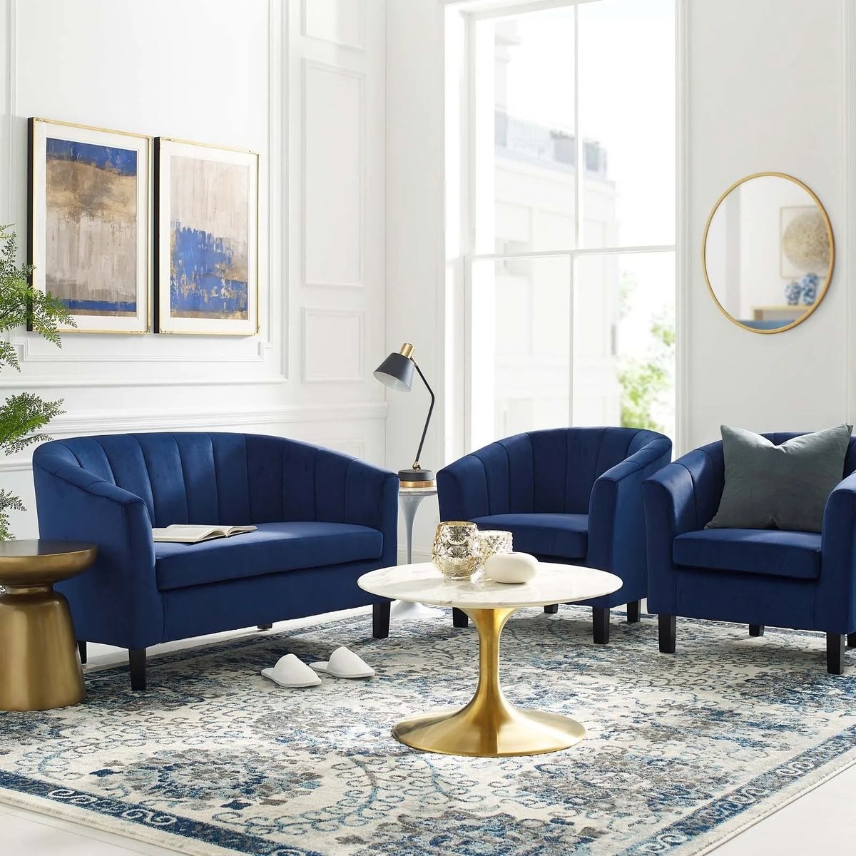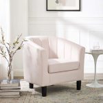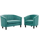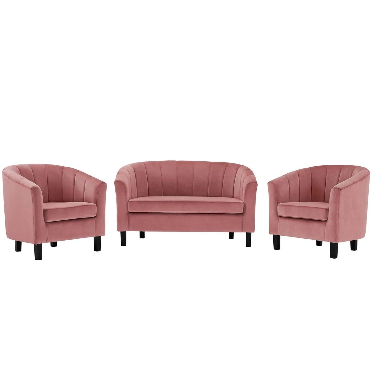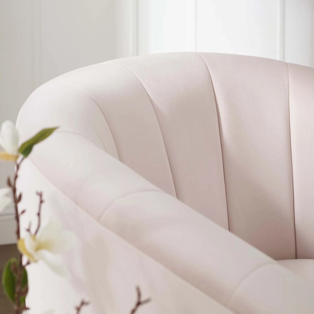 This barrel back set comes upholstered in stain-resistant performance velvet fabric, and boasts chic channel tufting, updating the Chesterfield-inspired profile with retro-modern design elements.