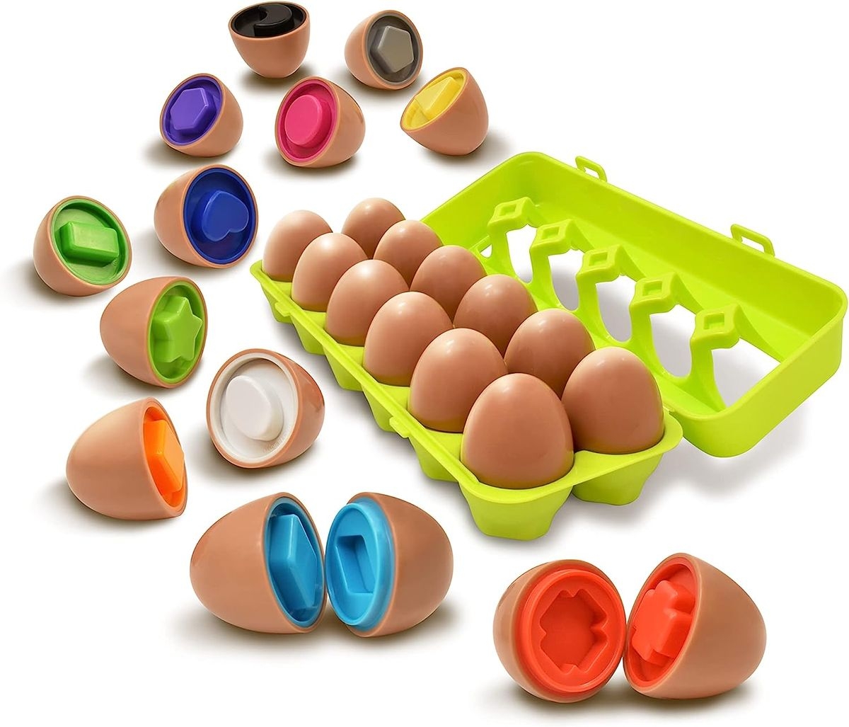 This set contains 12 coloured eggs that split in two, revealing a unique color and shape. With an easy-to-hold, smooth shape perfectly sized for little kids, these adorable eggs are sure to hook your tot’s attention as they try to take them apart and put them back together! reat for assisting your child in developing fine motor skills & hand eye co-ordination. 10 months +