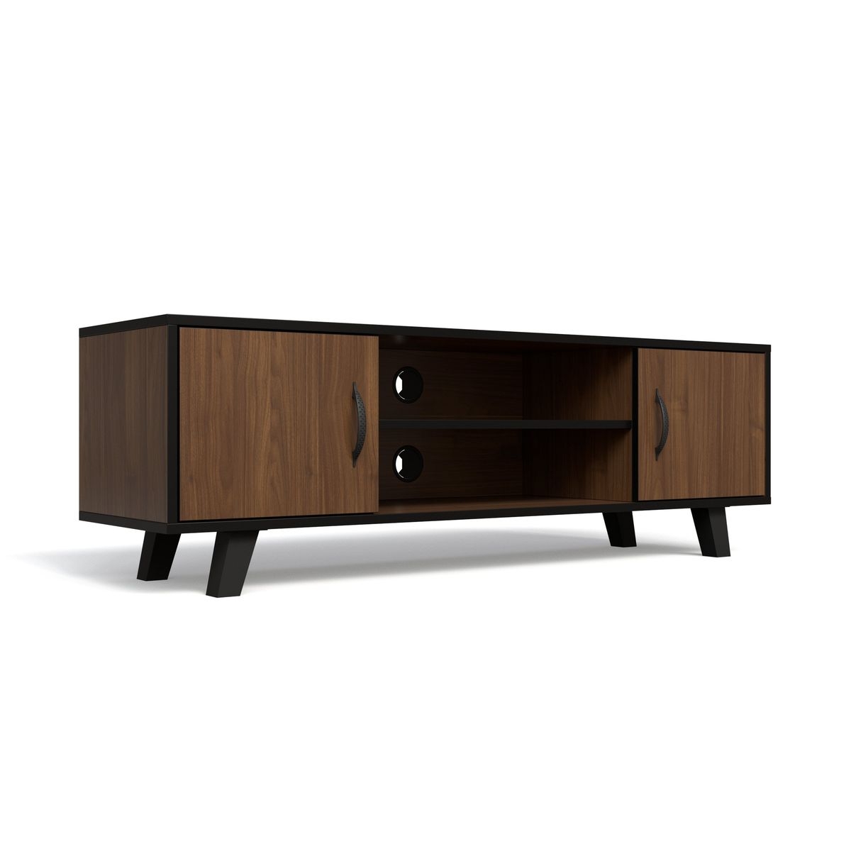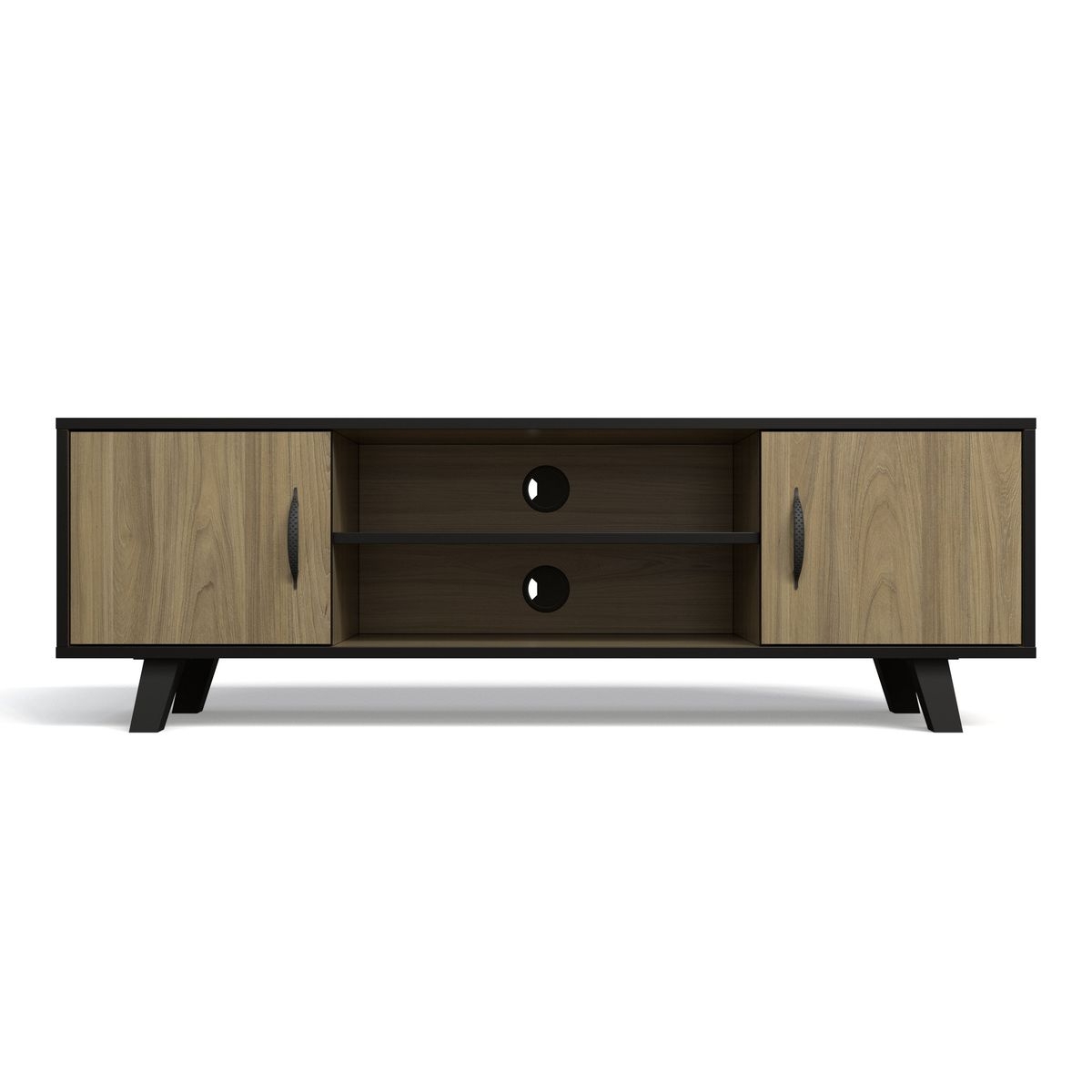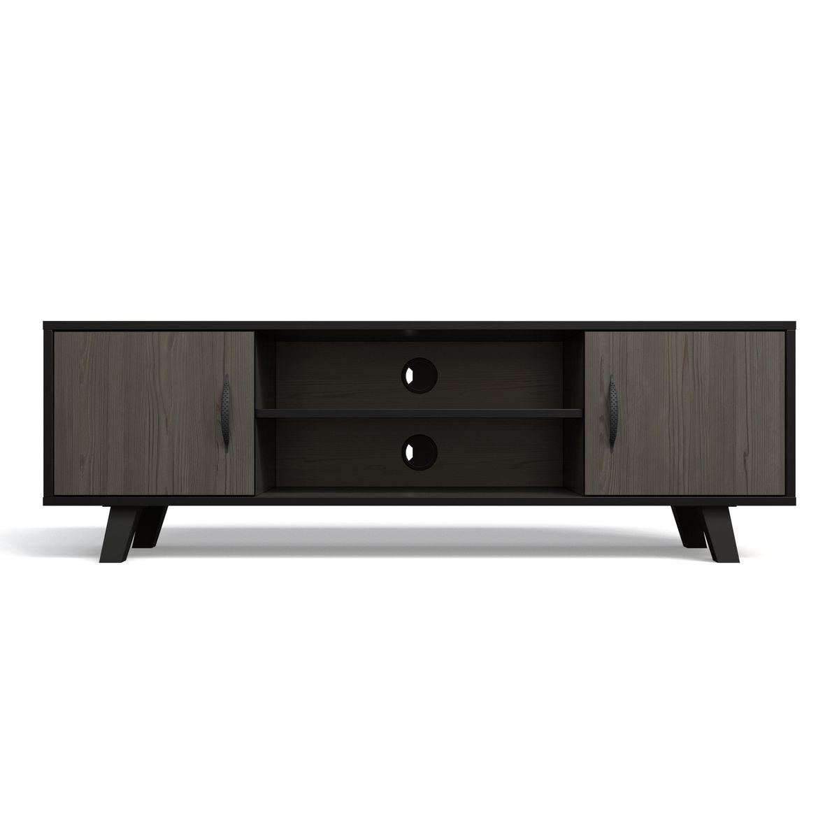 This entertainment stand features two closed cabinets with doors, allowing you to store items neatly out of sight while keeping your space organized. The central open shelf is perfect for media devices, gaming consoles, or décor, while built-in cable management holes ensure a clean, clutter-free setup.