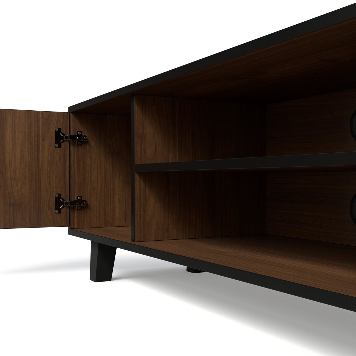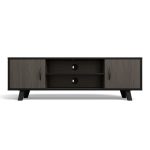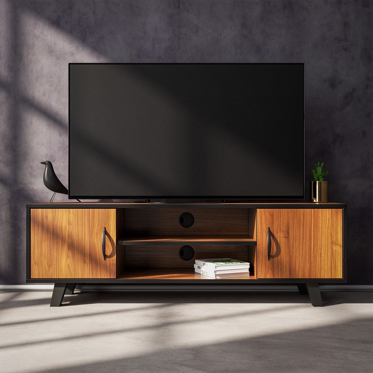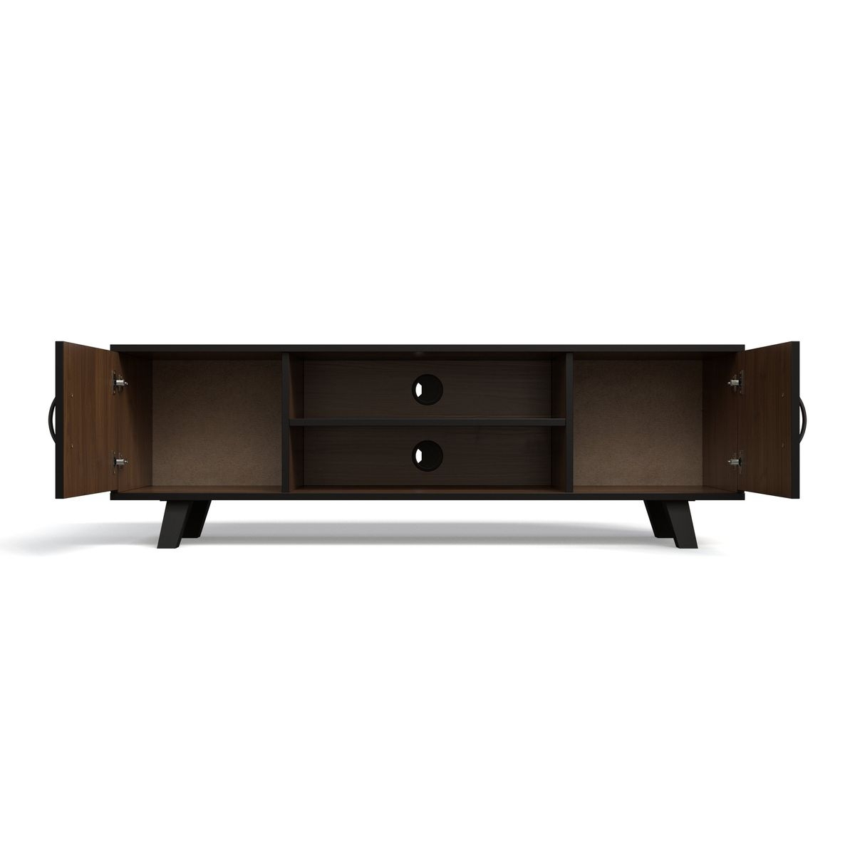 This entertainment stand features two closed cabinets with doors, allowing you to store items neatly out of sight while keeping your space organized. The central open shelf is perfect for media devices, gaming consoles, or décor, while built-in cable management holes ensure a clean, clutter-free setup.