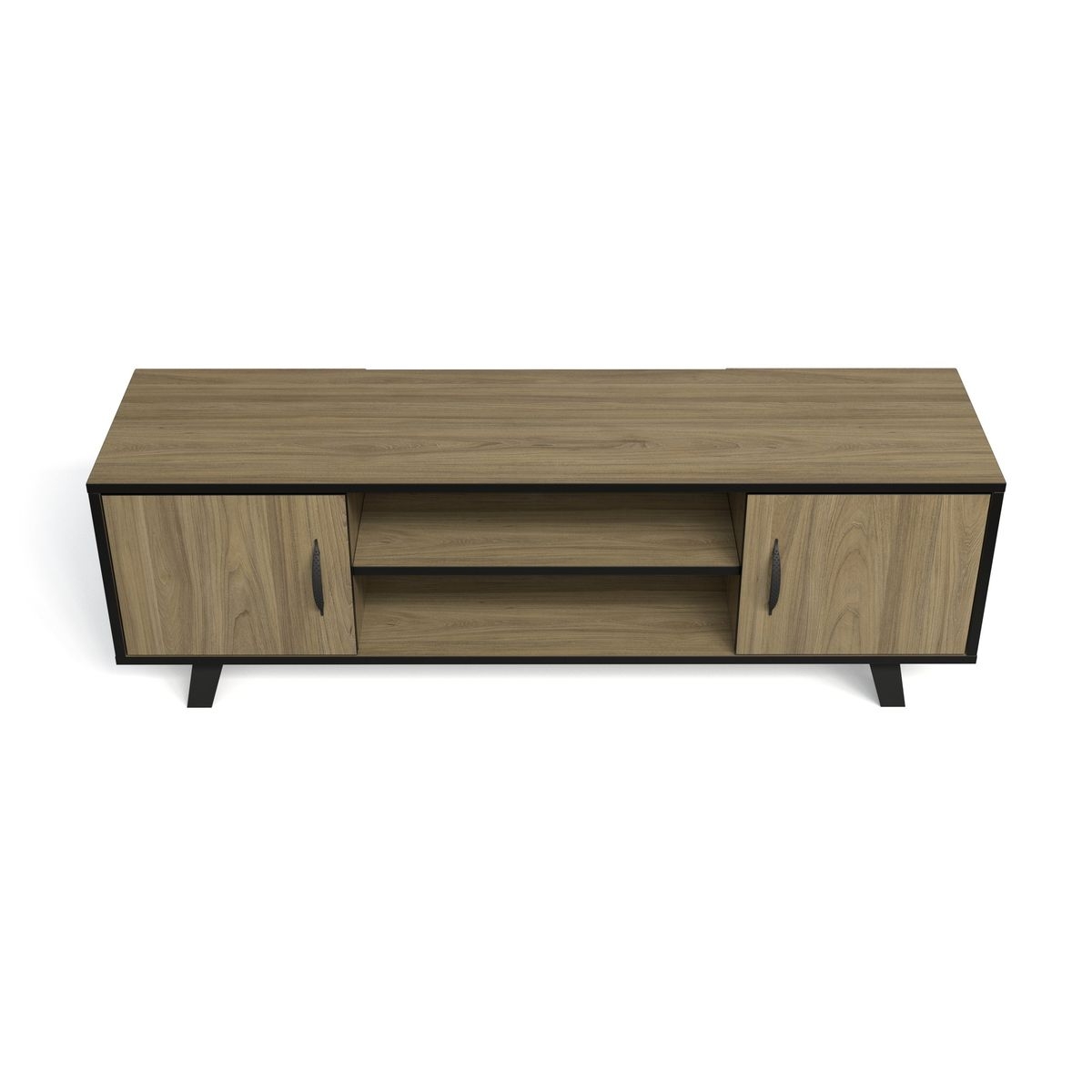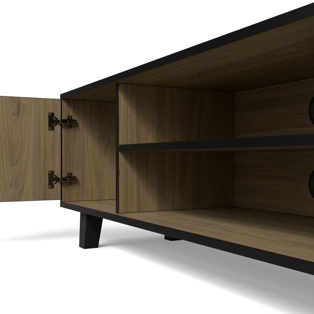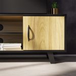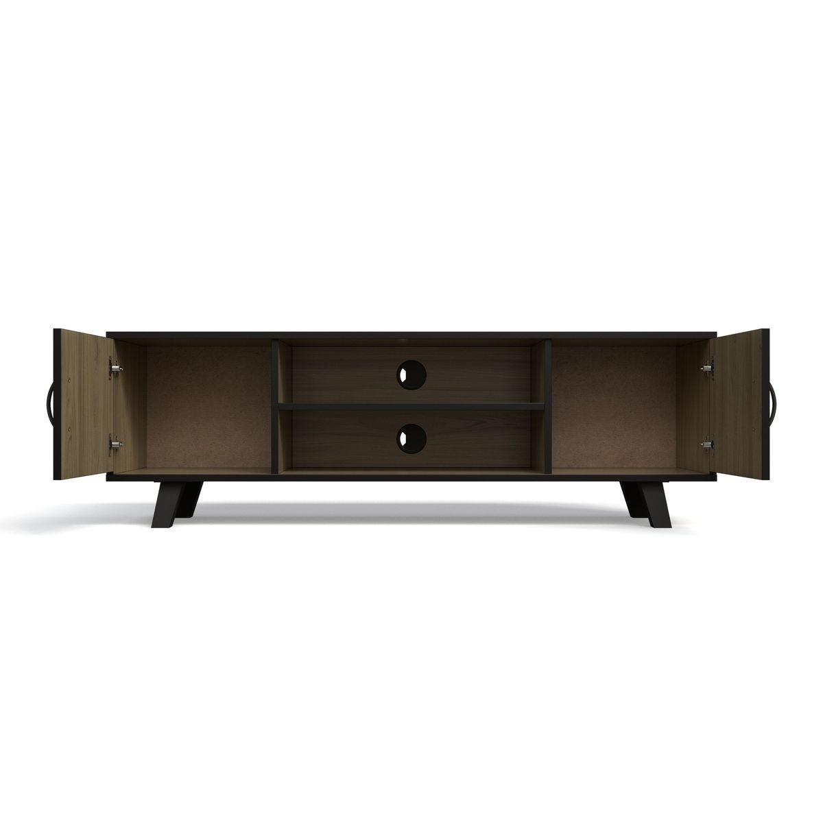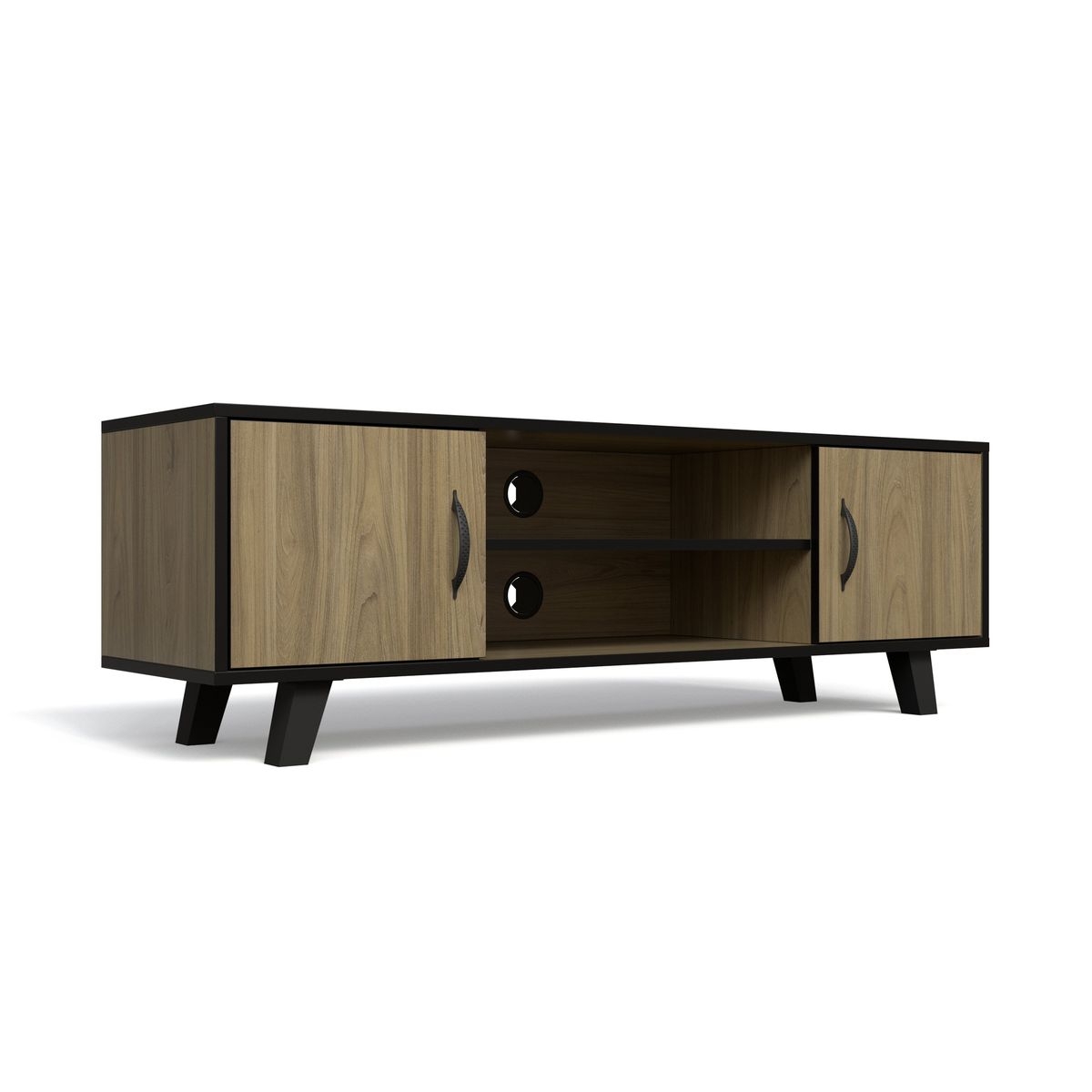 This entertainment stand features two closed cabinets with doors, allowing you to store items neatly out of sight while keeping your space organized. The central open shelf is perfect for media devices, gaming consoles, or décor, while built-in cable management holes ensure a clean, clutter-free setup.