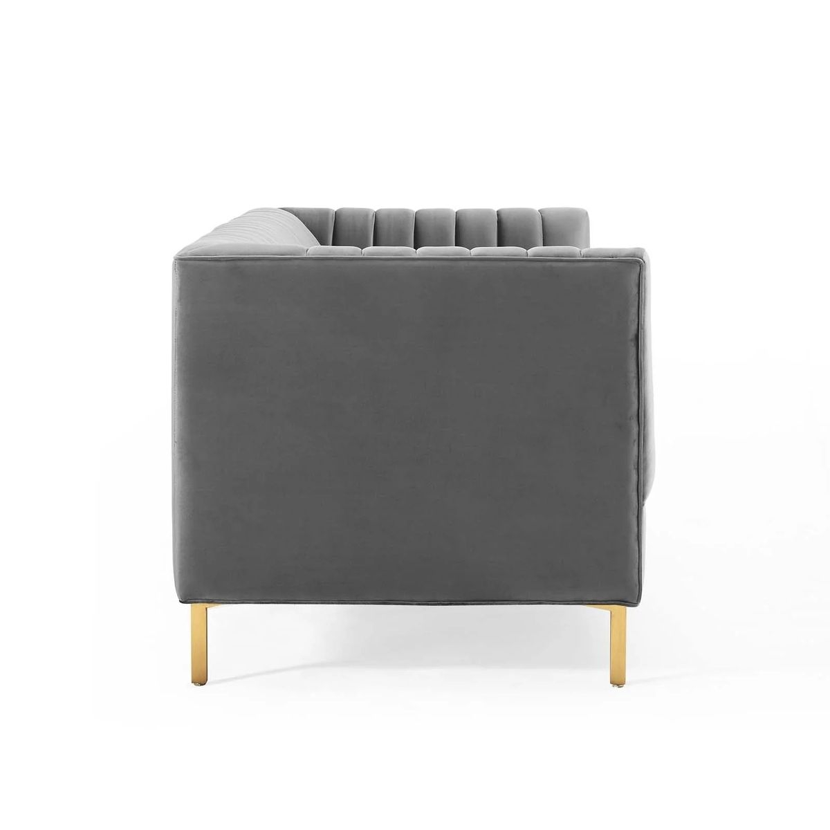 The shift velvet sofa rests securely on four gold stainless steel legs with non-marking foot pads to protect flooring. Assembly required