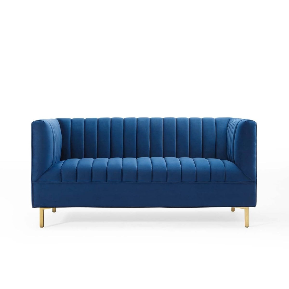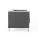 The shift velvet sofa rests securely on four gold stainless steel legs with non-marking foot pads to protect flooring. Assembly required