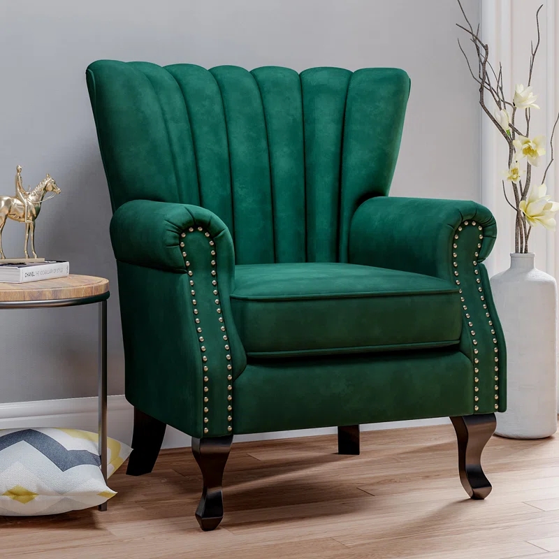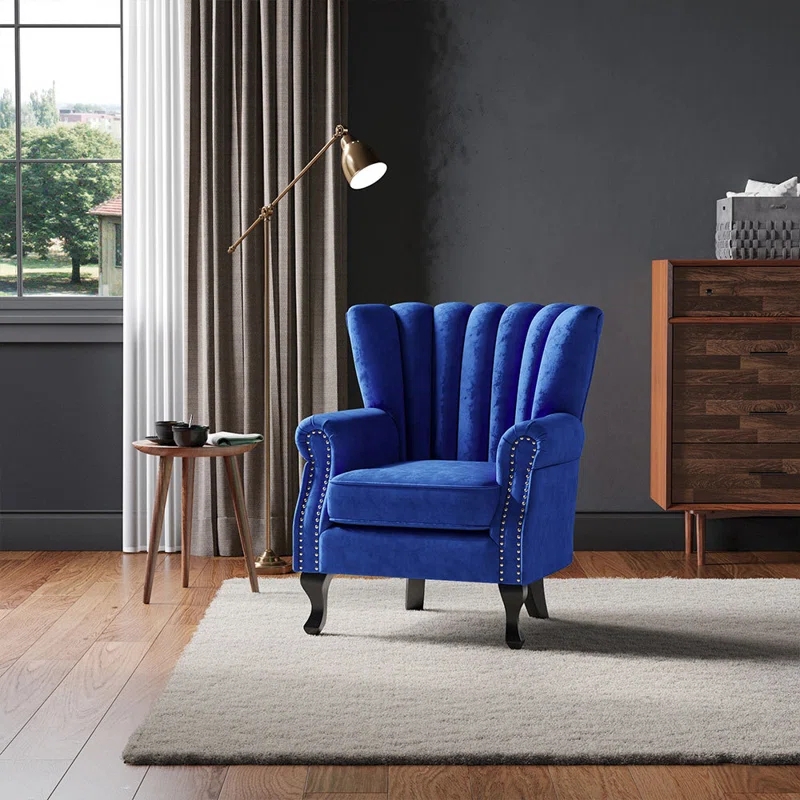 Features: – Elegant Style – A beautiful accent chair with winged sides, a high back, stitching details, silver studs to the arms and dark wooden legs – Luxurious Upholstery – Features smooth velvet fabric in a selection of shades. – Wooden legs in a dark wood finish. Deep cushioning to the seat and back offers comfort. – Neat Proportions – An ideal piece for compact spaces such as cottages, hallways, corners and offices. – Velvet Fabric – Wooden Legs – Panel Finish