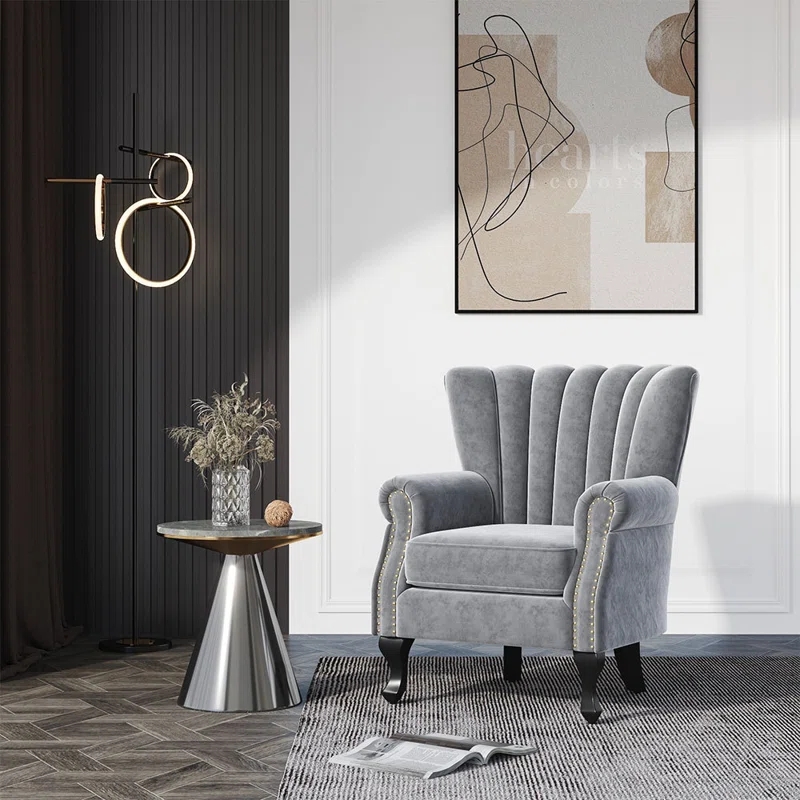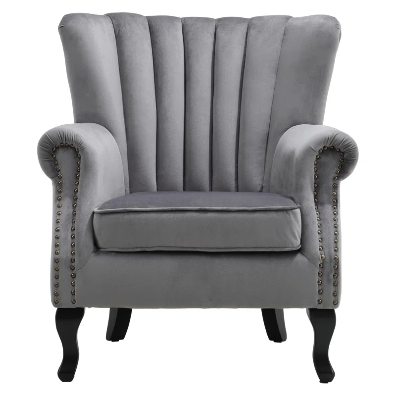 Features: – Elegant Style – A beautiful accent chair with winged sides, a high back, stitching details, silver studs to the arms and dark wooden legs – Luxurious Upholstery – Features smooth velvet fabric in a selection of shades. – Wooden legs in a dark wood finish. Deep cushioning to the seat and back offers comfort. – Neat Proportions – An ideal piece for compact spaces such as cottages, hallways, corners and offices. – Velvet Fabric – Wooden Legs – Panel Finish
